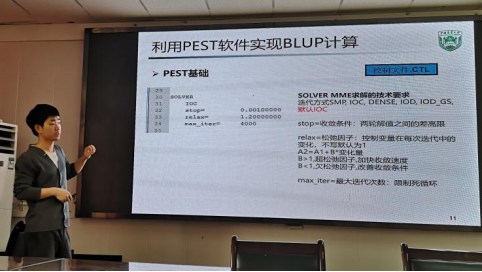 张海亮博士以“育种相关软件使用培训”为题,介绍了利用SAS软件进行因子分析、模型建立,以及PEDIGREE及PEST软件使用,并且利用DMU软件进行动物模型育种值估计。