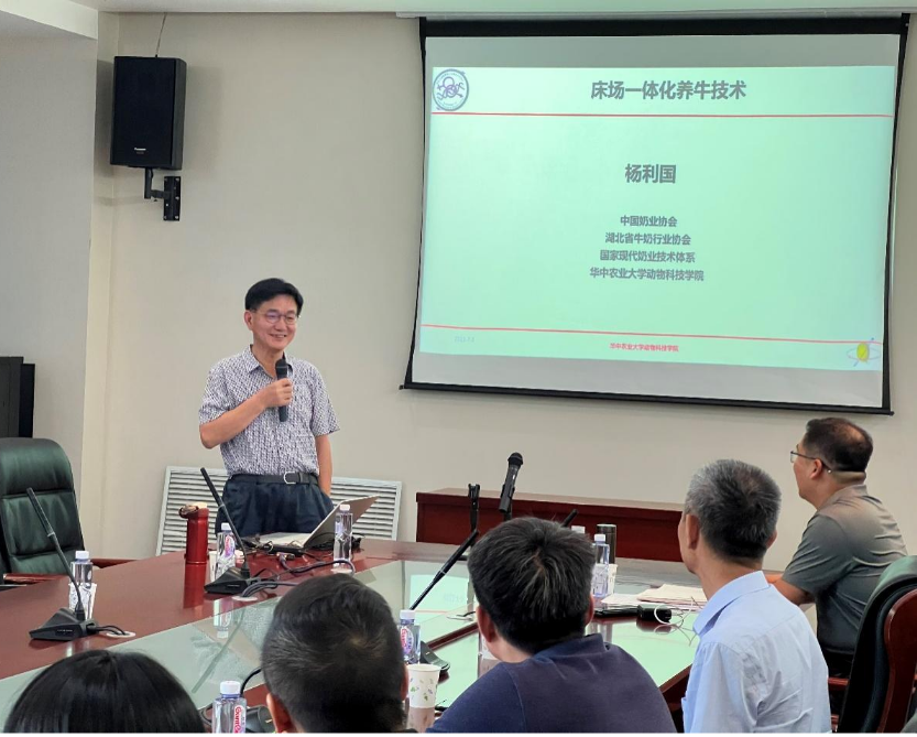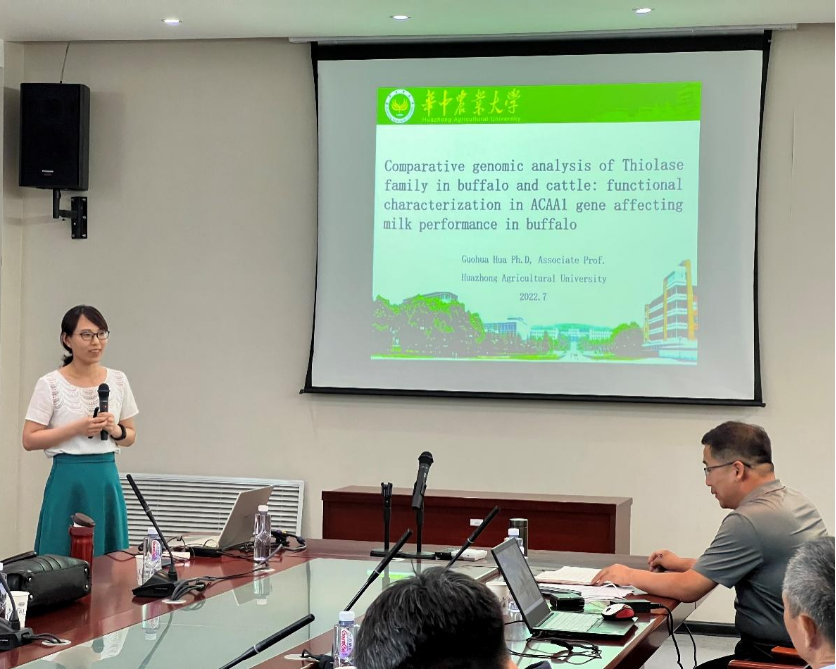 师生开展了一场学术报告会,杨利国教授针对“床场一体化养牛技术”进行了详细的讲解,其幽默风趣的言语、耐心细致的回答学生们在实践中可能面临的问题,赢得了全体师生热烈的掌声。滑国华副教授做了题为“Comparative genomic analysis of Thiolase family in buffalo and cattle: functional characterization in ACAA1 gene affecting milk performance in buffalo”的学术报告,主要从细胞水平、群体水平介绍了ACAA1基因调控奶水牛泌乳性能的研究。在互动环节,滑国华副教授对师生提出的问题进行了详细的解答。