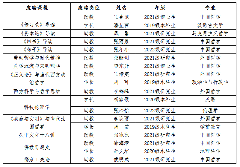 课程教学工作的要求,经过学生个人申请、评议小组筛选和面试小组面试,结合申请人对课程内容的熟悉程度、协调能力、组织能力、心理素质、健康状况及综合素质等,拟选录以下同学担任2022-2023学年秋季学期课程助教和课程学长: