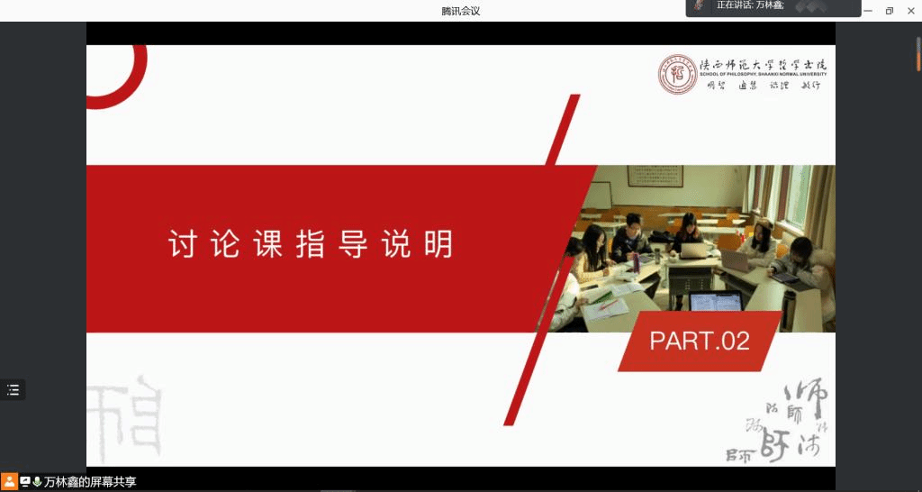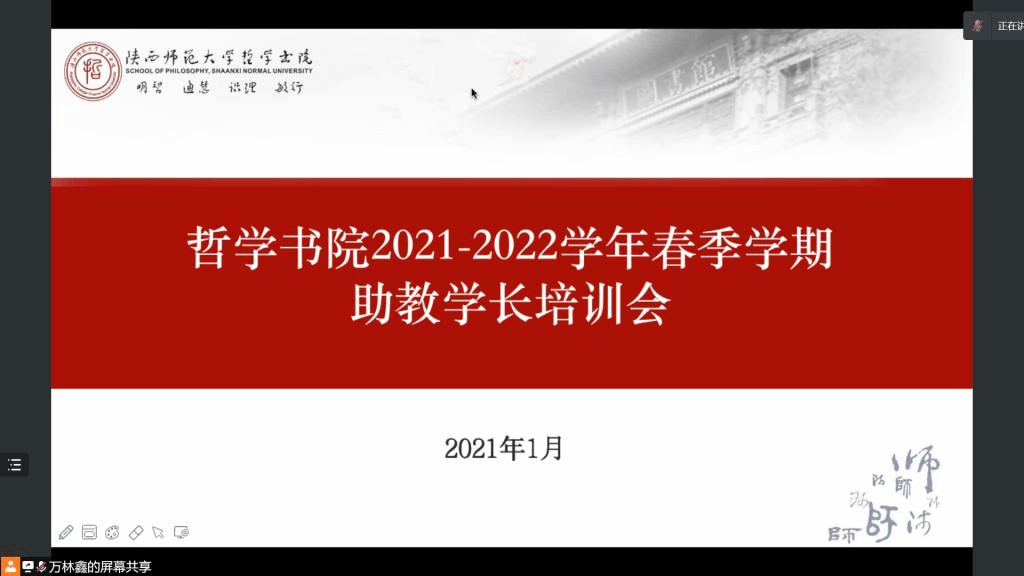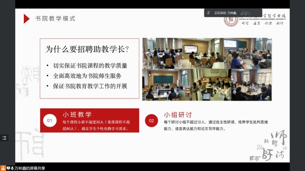 会议的第一项议程是由万林鑫老师介绍书院助教学长岗位的基本情况及工作职责等。万老师依此向助教学长们介绍了书院教学形式、课程构成框架、助教学长的岗位职责、讨论课相关说明以及工作中注意事项等方面,讨论课是书院教学工作开展过程中的重要环节,因此万老师对讨论课的开展细则以及时间节点等部分向各位助教学长进行了着重说明,最后强调到助教学长在工作开展中应多跟任课教师、班级同学沟通交流,给予同学们必要的关心关怀,希望大家能够“用心用情”给予书院每位学生帮助。