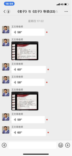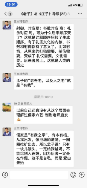 同样采取研讨方式的课程还有王文琦老师主讲的《<老子><庄子>导读》,该门课分两部分,课程前半段,王文琦老师通过语音授课的方式,为大家介绍了本课程的基本情况,带大家走进了老子和庄子。课程后半段,同学们在王老师的启发之下,积极思考,踊跃发言,因此可以说是直播和研讨相结合。对于老师的讲解,同学们很感兴趣,提问此起彼伏。难能可贵的是,在提出问题的同时,大家也有深入的思考。因此,王老师在悉心回答同学们提问的同时,也和大家进行了思想的交流与碰撞,可谓教学相长,互有进益。