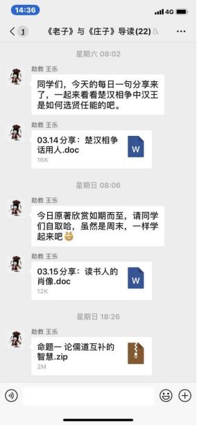 每日一句,别出心裁丰富第二课堂。除了线上授课外,书院多门课程还采取了别出心裁的“每日一句”经典研思活动,丰富学生第二课堂,既充分利用学生的碎片化时间,又极大提升学习自主性。所谓“每日一句”即由课程助教每周选取3-5句《论语》《孟子》《老子》等中国传统经典中的一句话,发至课程群中,每位学生结合自己的生活经验简谈对于经典的理解体悟。最先采取该形式的课程是《中国哲学的世界》,而后有《<老子><庄子>导读》的“每日分享”,类似的还有《基督宗教与西方文明》的“每日词条”,助教每天在课程群中提供和基督宗教文明相关的术语解释,一定程度上补充知识资源。坚持月余,学生们热情高涨、反响强烈,甚至发觉这样的每日哲思很有助于促进思想沟通,扩展其认知的广度和深度,提高学生的自主学习意愿和能力,具有很高的实践价值。