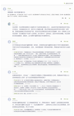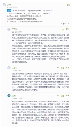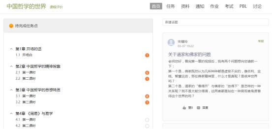 闻声知意,录播授课克服时空距离。常年以面授形式上课的老师,面对选课学生水平参差不齐的现状,书院的老师们在录课同时,非常注重课堂效果的最大化实现。《中国哲学的世界》是由许宁老师授课,在每周进行正式上课任务之前,由助教将许老师录制好的课堂视频上传至超星“学习通”平台,供学生们观看。因为课程内容非常生动有趣,在正式上课前,选课的学生都已将视频看完,而课堂就成为了师生以问题为核心进行研讨的一个开放空间。学习通的讨论区总是充满思想的火花,不少学生能根据老师的上课内容提出很有深度的问题,许老师会和学生一一回复。少了面对面的交流,这样的讨论对于老师、对于同学来讲,都是一种非常必要的弥补。