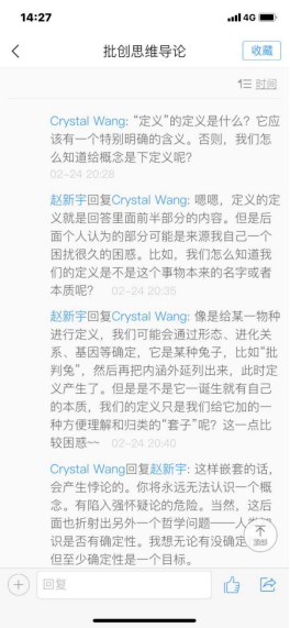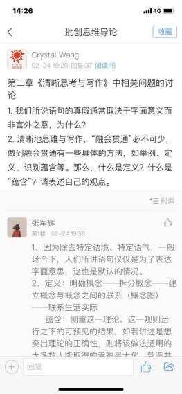 王晶老师的《批判性思维与哲学论证》课程是充分体现扑克牌游戏 育人特色的一门课,王老师引用中山大学熊明辉教授团队开发的《批创思维导论》课程资源,在超星平台开放讨论区,布置讨论话题,如定义的内涵与外延、如何运用必要条件与充分条件这组概念来判定事物之间的关系等问题,同学们各抒己见,王老师认真地对几乎每位同学的看法给出了回应,部分同学在老师回应的基础上再“回应”,这种“对话”意义上真正的讨论,极大地加深大家对所学知识的掌握程度。除此之外,讨论还在QQ群内继续延展,就经验不可能与技术不可能之间的差别等问题进行激烈的争论,人文科学与自然科学触碰之后的相得益彰有所显露。