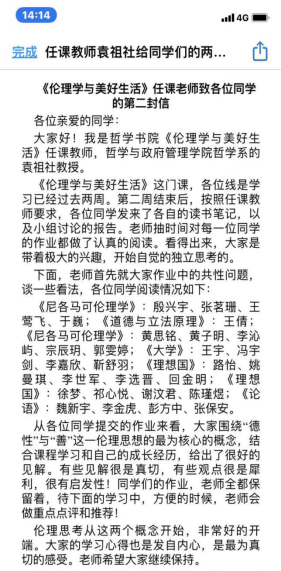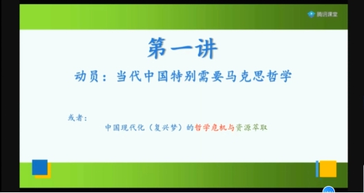 见屏如面,直播教学再现名师课堂。应现实需要,原本极不习惯线上教学的雷龙乾老师尝试突破限制,选用腾讯课堂的直播方式在线讲授《马克思哲学的世界》。这是一门和现实关联非常密切的学问,雷老师的课堂也因此十分注意让学科生活化,他从对现代化建设与马克思哲学之间的关系进行讲授,激发学生学习马克思哲学的热情,动员学生主动进行相关了解做思想准备,并布置了与当前形势相关的课后思考题,促进学生思考新冠肺炎疫情期间马克思哲学在其中是否有所体现等问题。这样的思考非常明显的展现出理论结合实际的马克思哲学的特色。学生们的思考也展现出作为一名公民对现实的强烈关怀,而学习哲学也为大家提供切入问题的不同角度,进而寻找解决问题的可能性。