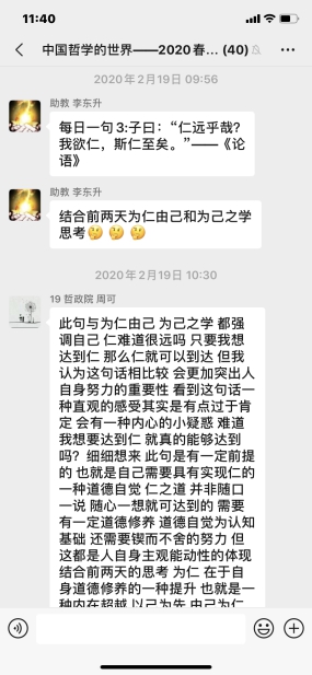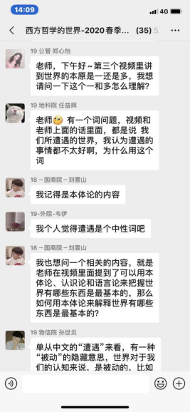 石碧球老师的《西方哲学的世界》一课,同样是以录课方式进行,其课堂的讨论氛围较之中哲课是有增无减。石老师注重培养学生的思维能力,他在录课音频中引领大家梳理了哲学的基本问题、可能旨趣、做哲学几种路向。课前已经完成观看任务的同学们成为了课堂的主角,他们出于对哲学的浓厚兴趣,从对课程的理解到自己疑惑的具体问题,在微信群中几分钟内会有十余名同学发问,石老师对其进行解答,助教作补充,其他同学也尝试互动解答,群内消息非常密集,几乎所有同学都参与讨论,如此热情高涨,使得一堂课有时甚至会延长至4-5个小时。这样的云端教学不仅没有拉开师生的距离,反而给大家提供更充分的交流空间。