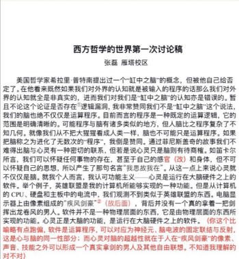 4月9日至11日,《西方哲学的世界》课程进行了本学期第一次研讨课,论题为“我(心灵)只是脑吗,脑只是运算程序吗,根据本课程所学你对心灵的认知是怎么样的?进一步探讨心身关系,以及心灵与他者(他人)、他物(动物、机器人)的界线,要求聚焦于“心灵”。此论题的选取源于在上月授课的“心灵”章节,有同学提议老师可以就一种学说与同学们展开批判与辩护,助教结合前几次讨论中同学们普遍非常感兴趣的人工智能话题,给了大家比较大的发挥空间。4月5日交电子版讨论稿至助教,助教批改回复;讨论课分三组,每组约十人,以腾讯会议为平台,每次时长2小时,同学们自由选组,也可旁听其他组。