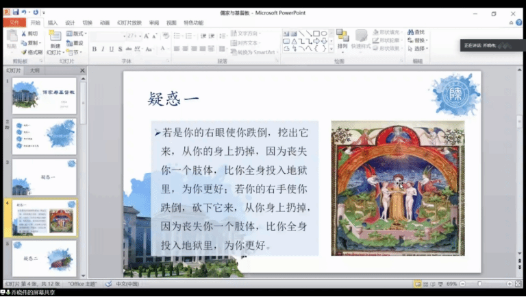 第九位发言的卢海成同学表达了他的“基督教是一个单纯的强制性统治的宗教”的观点,他认为,在历史上,基督教会往往为了维持和扩大统治秩序而违背耶稣基督的诫命及其所奉行的“真理”,有时出现教会统治者的行为和教义完全相悖的现象。高丽芳同学指出,这类现象的出现有一个特定前提,即只有在政教合一的环境中,才会出现为了维持政治秩序而用强制性的手段来向大众灌输价值观念的情况。齐以恒同学则指出,对历史资料的征引常常会因资料提供者的主观立场而偏离客观,事实上各种历史叙事都难免具有视角性和主观建构性。因此最好先对基督信仰本身的内容有所把握,再对相关的问题给出评判。其他同学也依次进行了发言。