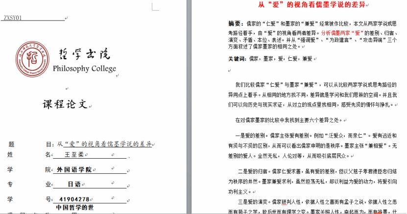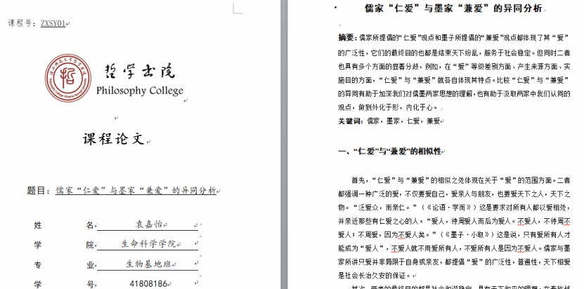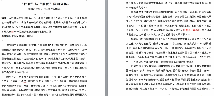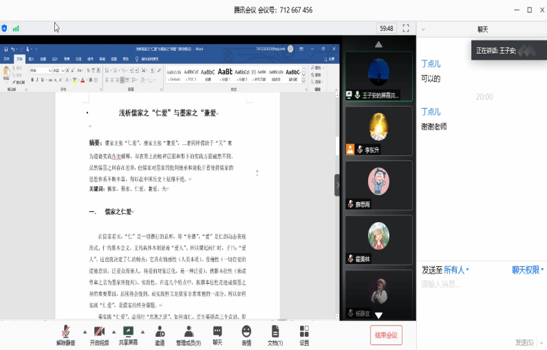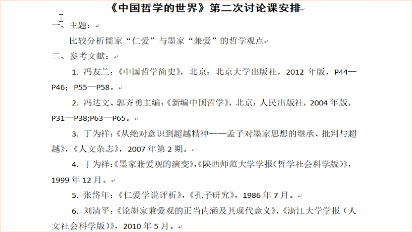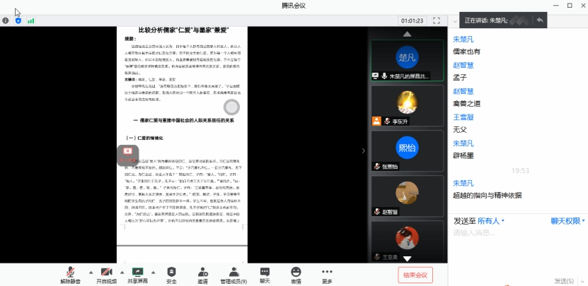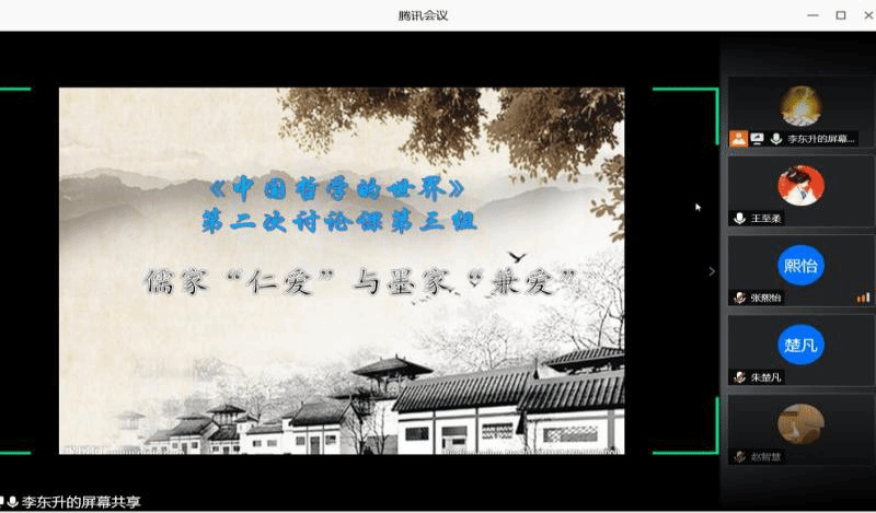 按照发言顺序,每位同学一次进行自己的讨论课主题发言。邓巧悦从考察儒家仁爱和墨家兼爱的思想内涵为出发点,探究儒家“仁爱”和墨家“兼爱”理论的建构逻辑,比较、分析仁爱和兼爱思想的异同之处及二者具有的历史价值。宋瑾玲认为儒家的“爱人”是在强调身份的前提之下,在每一个阶层内部“行仁”;墨家则认为爱的对象是所有人,他们之间享受“爱”的权利是同等的。樊力玮主要探讨儒墨两家对于“爱人”思想的异同,认为“爱人”是儒、墨两家均主张的思想,都是关乎天下的和平理想。而在各自的学说里,“仁爱”是有差等的,“兼爱”是无差等的。周可则提出“仁爱”与“兼爱”分别是儒家与墨家思想的核心要义,其中“兼爱”思想正是墨子对儒家“仁爱”思想进行学习批判之后的产物,通过认识“仁爱”与“兼爱”的形成过程,理解“仁爱”“兼爱”的异同所在,可以体会两者之间的内在关联。杨雪琴指出面对混乱的社会局面,孔子和墨子都提出了“爱人”的主张,以此来构建社会伦理秩序,二者在具有一定相似性的同时,也具有诸多差异,如伦理动机、爱人的顺序、爱人的手段等方面有所不同。张磊认为儒家“仁爱”与墨家“兼爱”分歧的最大原因在于孔子和墨子出身不同,所处的时代也不同,但二者以人为本的理念又使得他们具有相同点,且二者最终目的都是为了百姓安居,如今实现中华民族伟大复兴的重要节点已经到来,我们要重新审视“仁爱”与“兼爱”。周思琦提出孔子以仁为最高的道德, 墨子以兼爱为最高原则, 可以说都是宣扬人类之爱,但是仁爱中没有消磨阶级差异,讲究先亲而后外,于现代社会有些不妥;墨家讲究兼爱,强调了爱无差,但也有其局限。