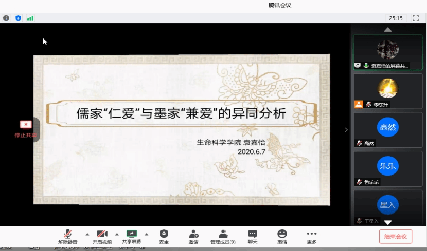 孙诗颖同学第一位发言,谈到儒家仁爱观与墨家兼爱观的区别,认为兼爱是一种无差别的爱,仁爱是一种有差别的爱,而兼爱观的缺陷在于它没有实践基础,并从兼爱的英文翻译变化看兼爱的丰富内涵。薛思雨通过比较分析儒家“仁爱”与墨家“兼爱”,认为墨家的兼爱观是在儒家的仁爱思想的基础上提出来的,以其“兼爱”来取代儒家的亲亲之爱,墨家的思想最具人民性,因为它将一切人都作为爱的对象,而仁爱思想并没有否定阶级,但一直以来是我国古代思想的核心。杨静宜比较了仁爱与兼爱的差异,提出仁爱是以自身为中心、由近及远的呈辐射状的爱,墨家的兼爱思想虽然对宗法等级制有了一定的突破,但仍存在阶级贵贱的区别。王子安认为儒家主张“仁爱”,墨家主张“兼爱”,二者同样借助于“天”来为道德实践作出解释,却在形上的精神层面和形下的实践方面截然不同。李选晋认为仁爱和兼爱在很多方面存在差异,有各自的可取之处,也有一些内在的逻辑悖论,因此对于二者理论的内在逻辑需要加以考察,对二者存在的差异也需要仔细辨识,在此基础上我们才能形成对儒墨两家核心思想的正确认识。霍美林首先从儒家仁爱和墨家兼爱思想的基本内涵出发,结合《论语》《墨子》的文本阐述各自的思想内涵,并从实践的角度,探寻了两种思想的可行性和适用性,最后结合现实,探讨其各自的积极意义。张佳丽同样先辨析了儒家 “仁爱”与墨家“兼爱”的差异,但却提出儒墨在义理上的辩论进而达到融通的观点。丁点儿通过对比分析“仁爱”与“兼爱”的理论内涵,从“孝弟为本”与“博大无私”,探讨两种学说各自的理论出发点;从“为仁由己”与“交相利”,理解分析“仁爱”与“兼爱”的动力来源。