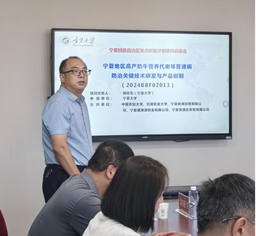 项目负责人郭延生教授汇报了“宁夏地区高产奶牛营养代谢等普通病防治关键技术研发与产品创制”的主要研究内容、课题设置、实施方案及考核指标等情况。