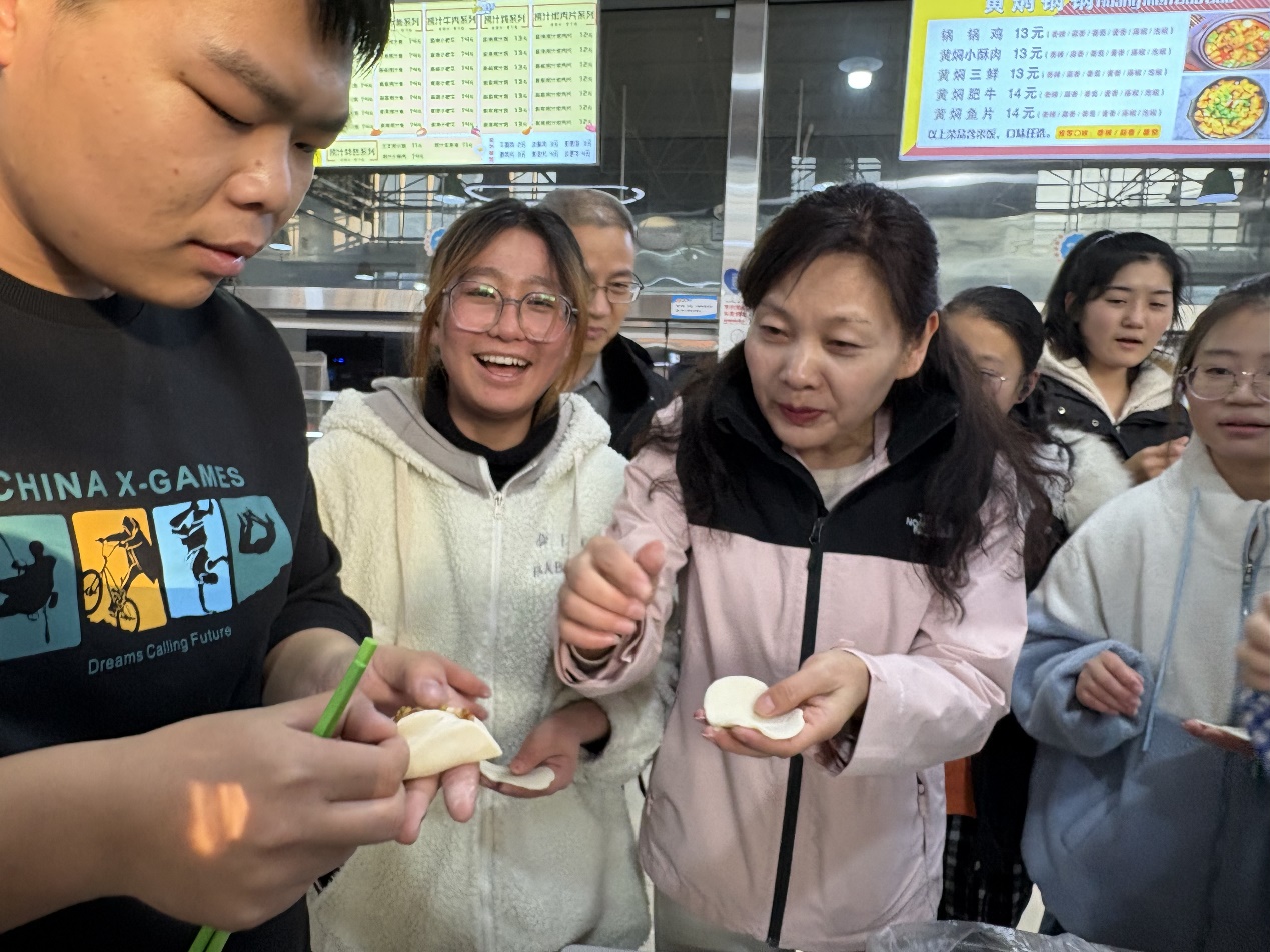 领导和书院领导亲临现场,与同学们一起动手包饺子、聊家常,现场气氛其乐融融。领导们详细了解了同学们的学习与生活情况,并亲手示范包饺子的技巧,师生互动温馨而愉快。