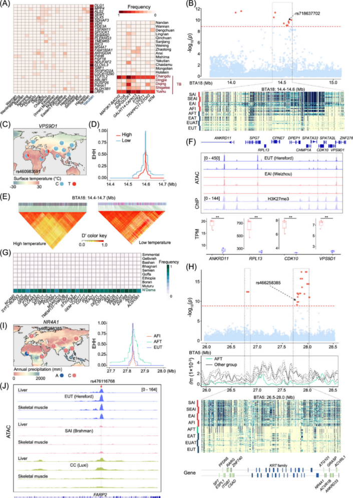 气候变化对动物种群构成多重挑战。本研究整合85个家牛群体、744个样本全基因组数据及28项气候因子,通过环境全基因组关联分析鉴定到3165个与气候显著关联的SNP,其候选基因主要参与脂肪沉积、能量代谢、肾脏发育等通路,在极端环境牛种中存在显著遗传分化。在牛18号染色体强选择区域,发现与温度相关的调控位点,位于ANKRD11、RPL13、CDK10、VPS9D1等基因调控区;其中rs47611688为顺式eQTL,调控FARP2表达并与干旱指数显著相关。该研究通过整合全基因组数据与多维环境信息,系统揭示了气候因素驱动旧大陆家牛局部适应的遗传机制,为家牛气候适应性分子育种与可持续选育提供了关键遗传标记和理论依据。