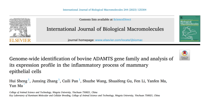 马云教授领衔的宁夏优势特色牛产业科技创新团队在国际知名学术期刊《International Journal of Biological Macromolecules》(IF=8.2,中科院1区top)发表题为“Genome-wide identification of bovine ADAMTS gene family and analysis of its expression profile in the inflammatory process of mammary epithelial cells”的研究论文。