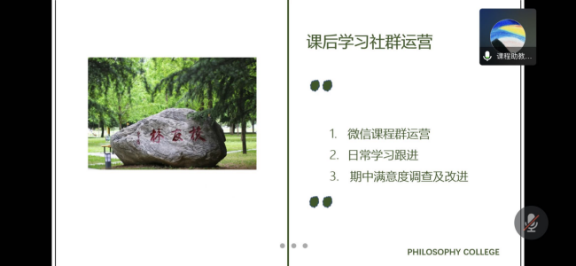 在四位老师的分享之后,2019级博士敖安娜作为课程助教代表,对担任助教期间的日常教辅工作、讨论课组织管理进行总结,分享了自己“学习·读书·反思”的成长和“求知·爱·感动”的收获,她用“是我们的认真努力与热情投入,才让这段日子美好又难忘!”为自己这段相伴共学的云学习旅程画上圆满句号。