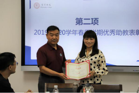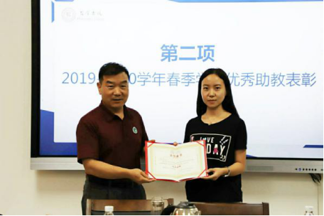从上学期开始制定并贯彻落实助教考核制度,经评定,敖安娜和王乐获评为2019-2020春季学期的优秀助教,袁祖社老师也为其颁发了优秀助教证书。在本次会议中,助教们听取了每位助教工作的有益经验和老师们的宝贵建议都感到受益匪浅,对接下来的助教工作有了新思路,对如何成为一名优秀的课程助教有了新思考。