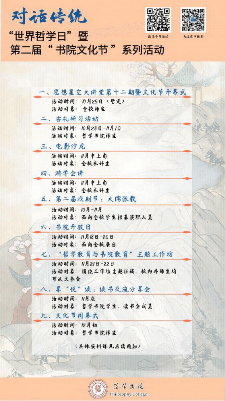 以“对话传统”为主题,开展第二届书院文化节,以现实为着眼点,与传统展开对话,寻求经典中安顿身心的力量和指明未来方向的能力,彰显出书院把握时代精神,坚守文化自信的使命和担当。