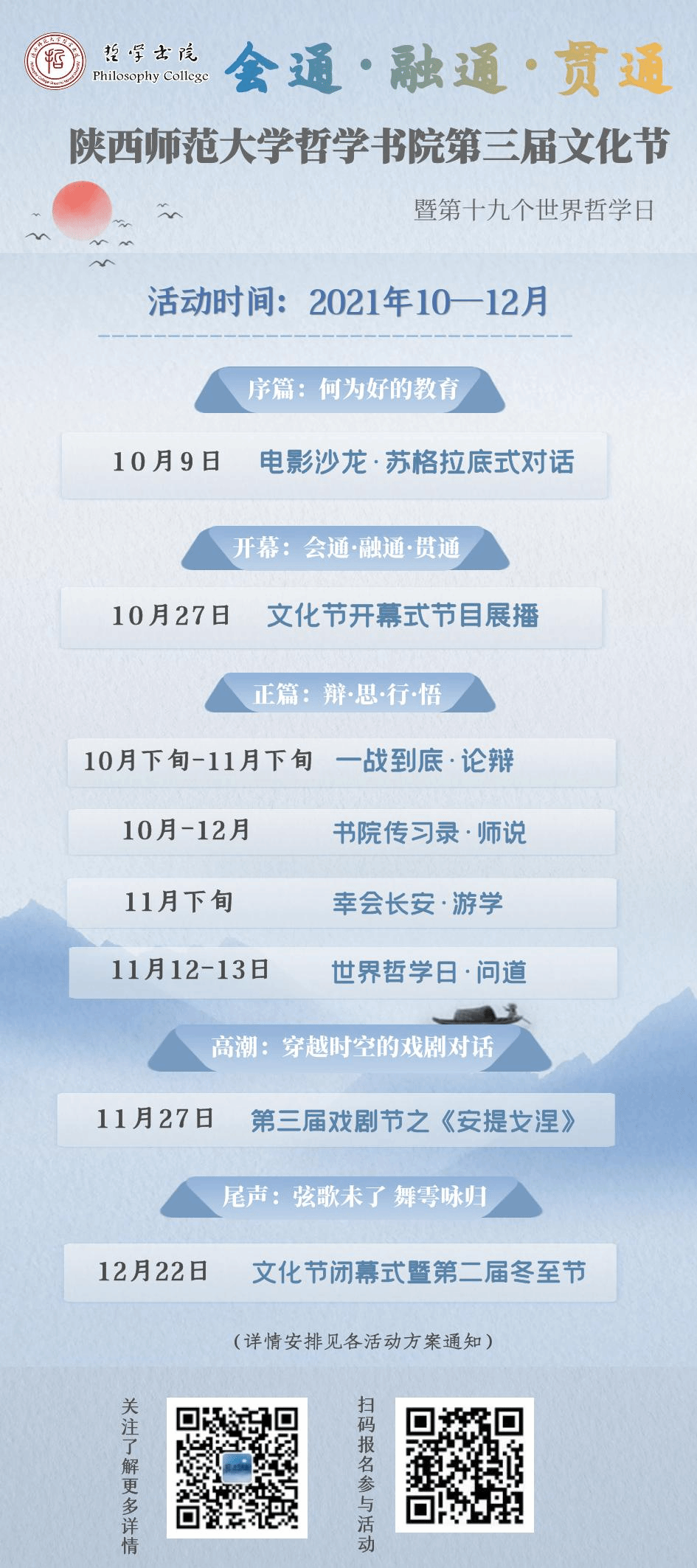 第三届文化节将以“会通·融通·贯通”为主题,通过众创众编、互学互鉴、同修互参等形式举办多姿多彩的学术和文化活动,以交叉促融合、以批判启新思,在理论和实践的双重探索中,重新审视现代性下中西方文化的碰撞与共生。