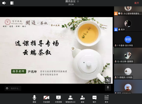 活动伊始,尹兆坤老师表示本次云茶叙旨在对书院学子进行选课指导,帮助大家全面细致地了解所选课程,并搭建一个积极的、活跃的、阳光的平台,加深大家对书院的了解。至此,一场师生之间关于选课指导与选课经验的分享就在这样愉快的氛围中展开了。