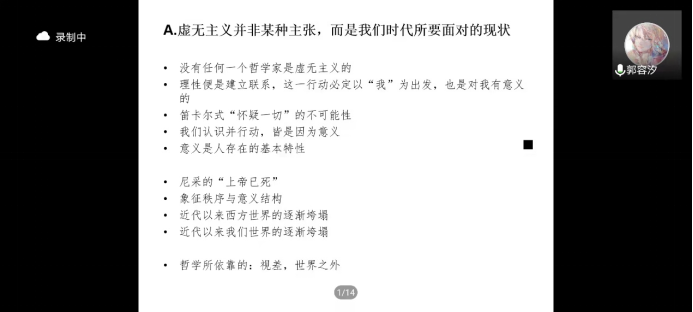 2019级哲学系新文科班的郭容汐。他从虚无主义的定义及现代的虚无主义、批判现代的虚无主义来探究虚无主义背后的原因并描述虚无的表现、虚无主义与相对主义的区别以及如何避免虚无感的方法