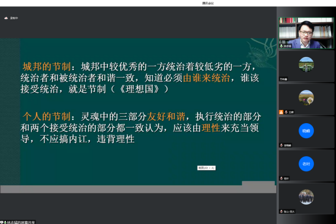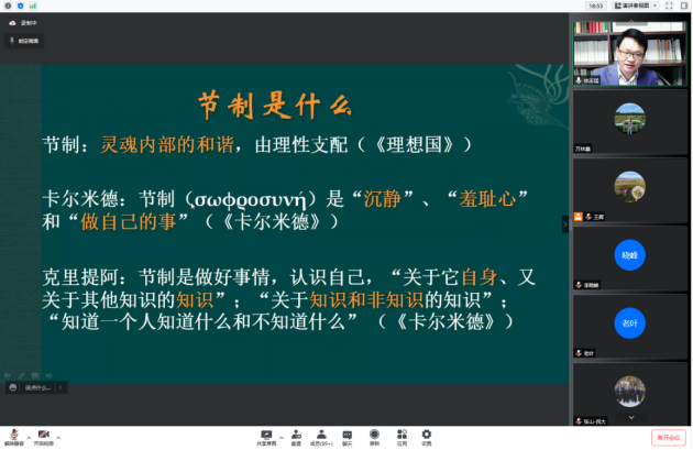 讲座伊始,林志猛老师首先介绍了柏拉图在不同作品中对节制有各种层面的理解。柏拉图在其他对话提到节制多数和身体方面有关联,涉及欲望的控制,《会饮》里节制是“对快乐和欲望的控制”,《斐多》里多数人的节制是指对欲望之事不会感情用事,在《普罗塔戈拉》对话里,节制被看作是首要的政治德性,在《理想国》里,节制涉及方面很丰富,提到了城邦的节制与个人的节制。所谓城邦的节制指的是:政治不是随意的统治,有德政的取向,要知道必须由谁来统治,谁该接受统治,也就是城邦中比较优秀的一方来统治比较低劣的一方,统治者和被统治者要各司其职,处于符合自己本性的合适的位置,这就是节制,至于个人的节制则指个人灵魂的三部分应该处于统一有序的状态,由理性来支配,不应违背理性。