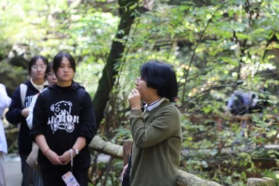 抵达龙口瀑布,伴着潺潺水声与流动的登山人群,王云霞老师为我们进行了此次游学的会讲。王老师提到,秦岭是我们国家的中央水塔、中央氧吧、中央空调与南北分界线。八百里秦川的风调雨顺,周、秦、汉、唐的绝代风华都离不开秦岭的气候屏障与水源滋养。习近平总书记从党的十八大以来就高度重视秦岭的生态保护工作,而我们这次游学也见证了我省秦岭保护工作的成果。王老师说,自己常去的是子午峪,但是太平峪给自己的震撼最大。太平峪是秦岭的七十二个峪口之一,巨大的水量汇成多条瀑布,其气势磅礴让联想到李白的诗句:“飞流直下三千尺,疑是银河落九天”。自然环境是人类可持续发展的后劲与根脉,如果没有秦岭作为生态屏障,西安也难以成为中国历史上的十三朝古都。从周朝开始,阿旁宫、大明宫、兴庆宫等宫殿的兴建都耗费了大量木材,因此我们现在所看的山林都是次生林,秦岭的原始植被都不复存在了。我们在登山游览的过程中还是能看到很多塑料垃圾,王老师提醒我们,我们到秦岭里来就是这里的客人,人与自然是生命的共同体,要尊重自然、敬畏自然、保护自然。在生活压力普遍比较大的现代社会,生活简单、亲近自然是很好的解压方式。大家看到的蓝天白云、青山绿水、石头青苔,都会打开我们的格局。最后,王老师表达了对同学们殷切的希冀:“浮生常博物,记得去看花”。希望将来能有机会去更多峪口,感受自然的美妙。