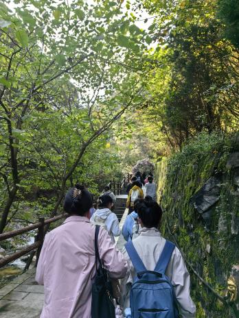 听完王云霞老师的会讲之后,同学们眼神明亮,脸上洋溢着满足和期待的笑容。也是王老师的这番话,让同学们重新审视起自己对于保护环境的责任和担当。带着这份深思,团队继续攀登。欣赏完龙口瀑布,一个重要的问题来了:坐索道还是徒步登山?在索道口徘徊着很多延宕的人,巨大的“上山一身汗,下山腿打颤”标语也预警了山路的艰难。两位老师与许多同学毫不犹豫地徒步上去了,也有一些同学由于身体原因选择坐索道。最终大家殊途同归,都抵达了彩虹瀑布。