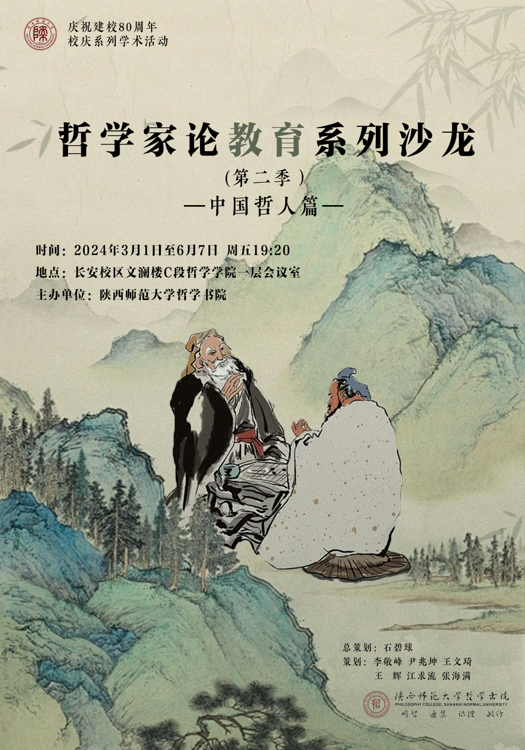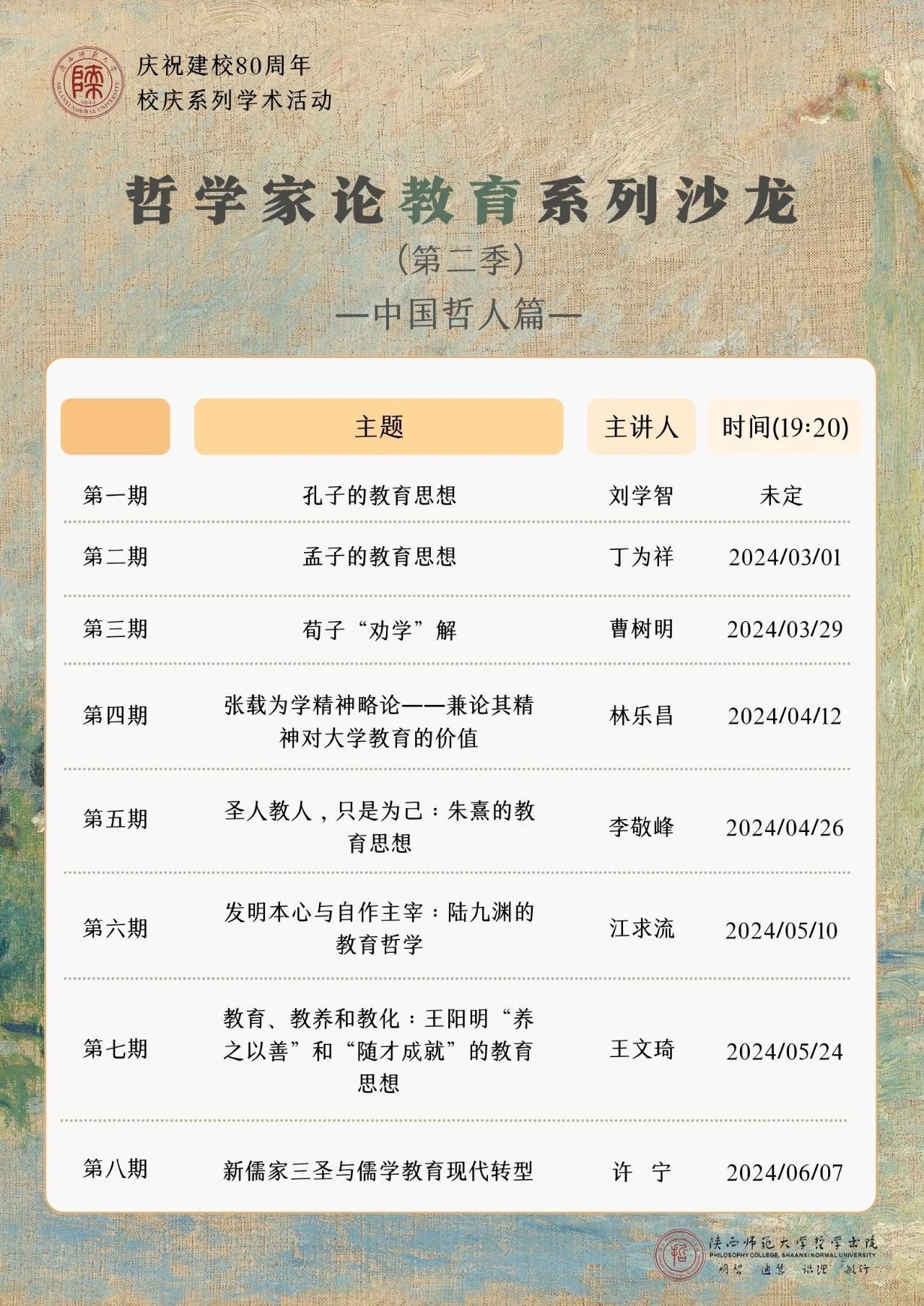 将在2021年举办“哲学家论教育系列沙龙第一季:西方哲人篇”的基础上,重磅推出“第二季:中国哲人篇”,拟邀请8位中国哲学领域的专家学者,围绕中国哲学先贤关于教育的经典论述和文本,带领大家对话中国哲学先贤,仰望思想的星空,把握教育的本质。敬请关注。