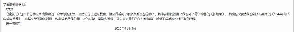 收到同学们的讨论稿修订版后,于讨论课前两到三日分享到所属讨论组并组内指定点评人。供大家提前熟悉组员讨论内容的同时,也在一定程度上保证讨论课上同学们的关注度和参与度。